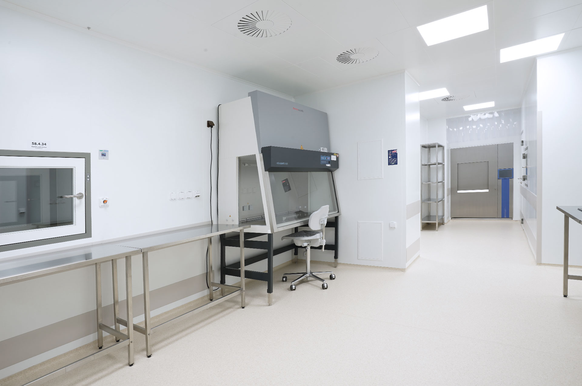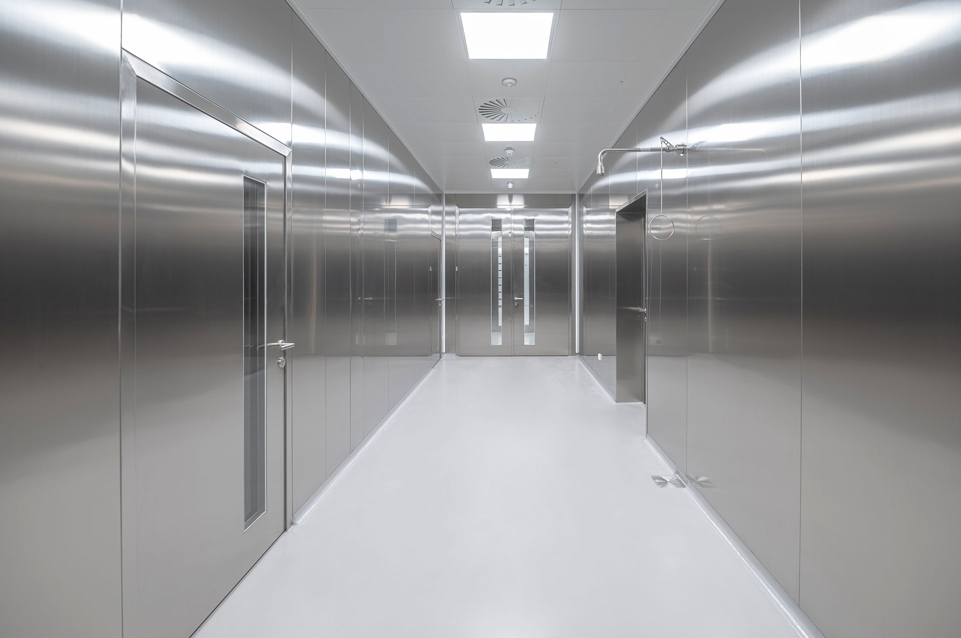 Air intake is provided by a central air-conditioning unit with total treatment of the supplied air. The components at the end of HVAC are a part of the cleanroom built-ins – they’re built into the walls and the ceiling.